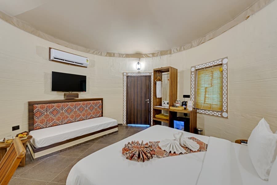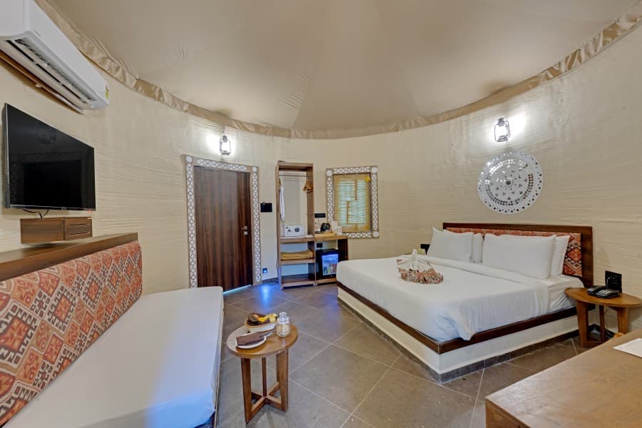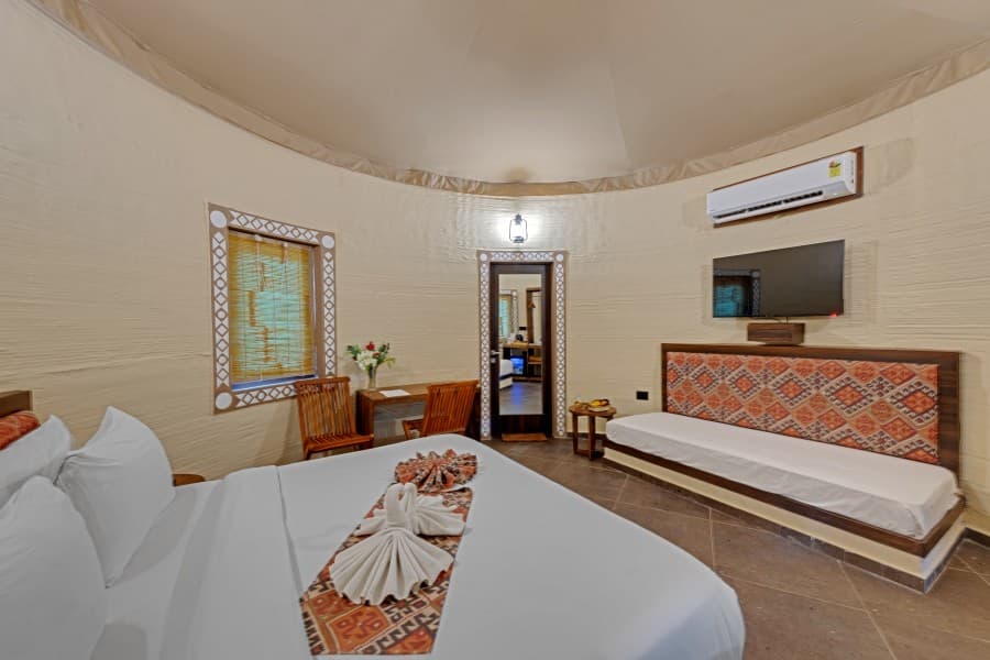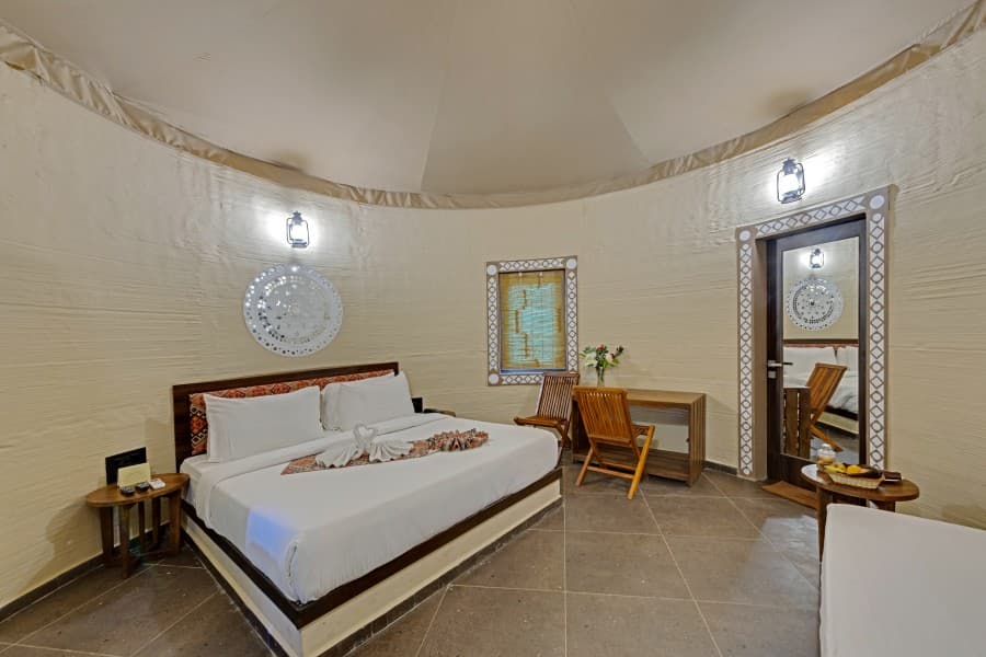 The Winter Green Garden View Tent is a charming haven marked by warmth, cozing and tranquility. Light and warm touches along quite a few modern conveniences be, creating within itself peaceful spaces where guests could enjoy a relaxed stylish stay.