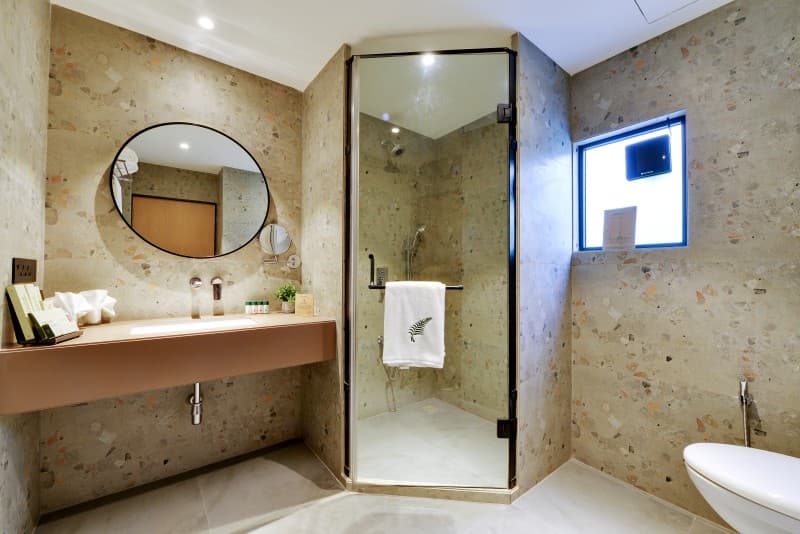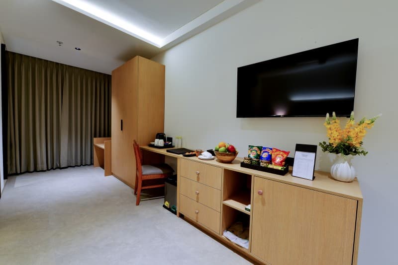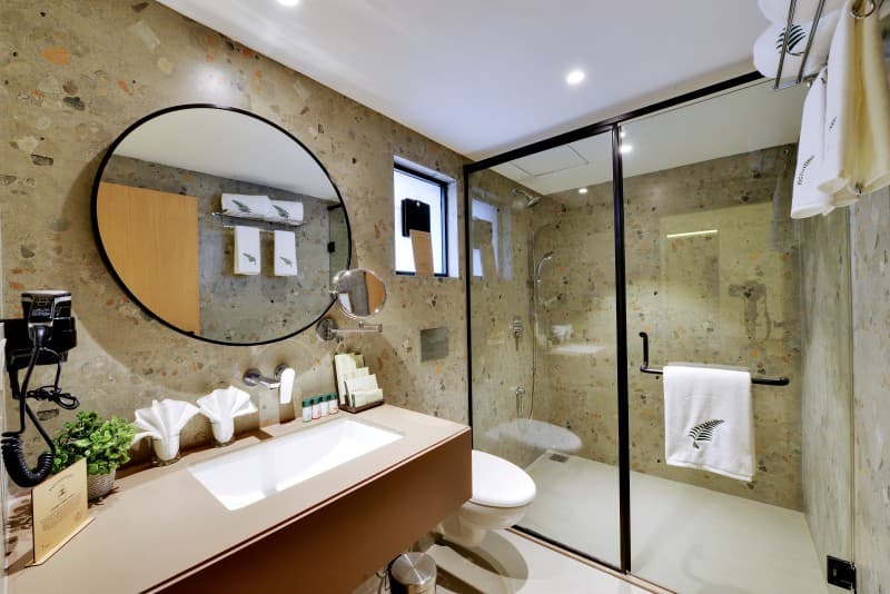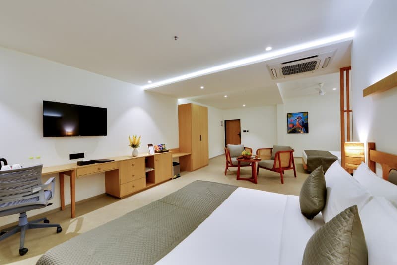 The rooms at The Fern, Kamrej are designed to offer a comfortable and refreshing stay, featuring modern décor, soothing color tones, and well-planned interiors. Each room includes essential amenities such as plush bedding, a work desk, complimentary Wi-Fi, and a flat-screen TV to ensure convenience and relaxation. Large windows allow natural light to brighten the space, while thoughtful touches and eco-friendly features create a calm and welcoming environment for every guest.